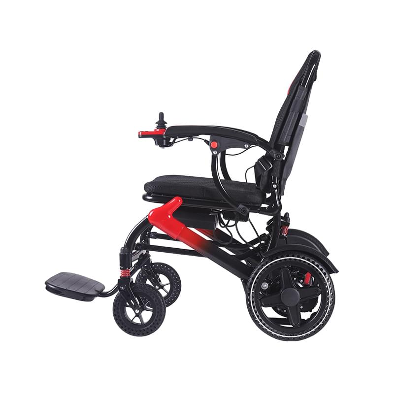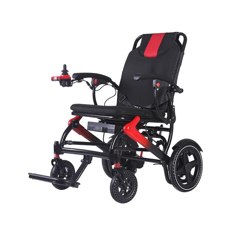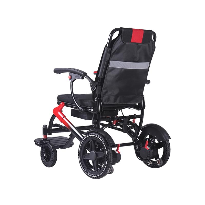 Our lightweight, foldable aluminum electric wheelchair weighs 36–40.1 lbs (≈18.2 kg) and features a one-touch fold mechanism. It fits easily into a car trunk for both home and on-the-go use.